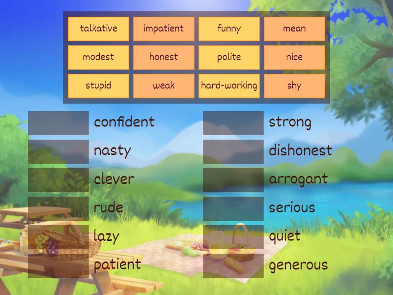 mean - generous, honest - dishonest, hard-working - lazy, weak - strong, talkative - quiet, modest - arrogant, stupid - clever, shy - confident, funny - serious, polite - rude, impatient - patient, nice - nasty,
