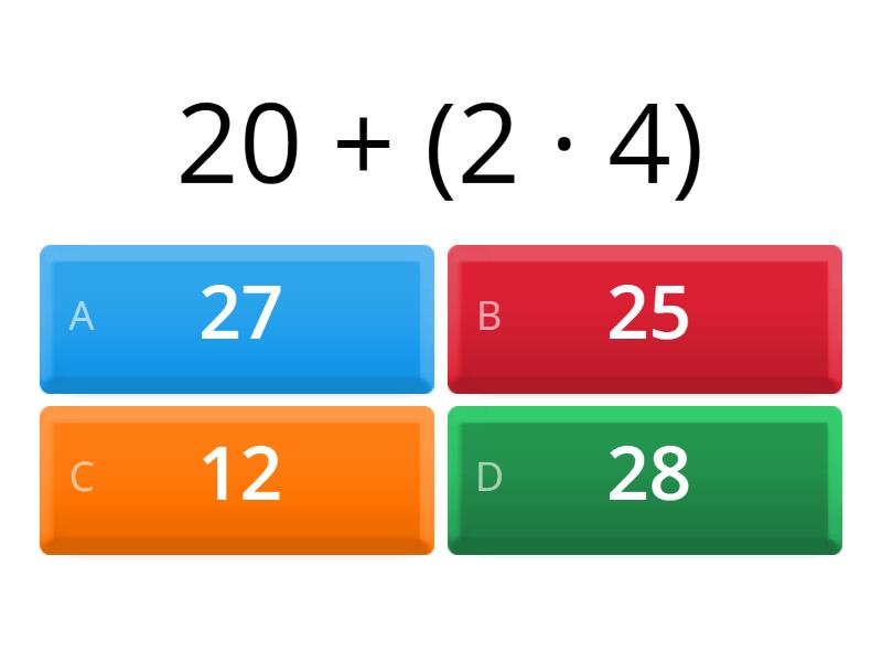 1) 20 + (2 · 4) a) 27 b) 25 c) 12 d) 28 2) 30 + (2 · 7) a) 44 b) 43 c) 40 d) 39 3) 27 + (3 · 4) a) 38 b) 19 c) 39 d) 37 4) 30 - (5 · 2) a) 21 b) 20 c) 22 d) 16 5) 20 - (6 · 2) a) 8 b) 10 c) 9 d) 12 6) 5 + (4 · 10) a) 45 b) 46 c) 42 d) 35 7) 7 + (2 · 9) a) 81 b) 18 c) 25 d) 24 8) 28 - (8 · 1) a) 18 b) 8 c) 2 d) 20