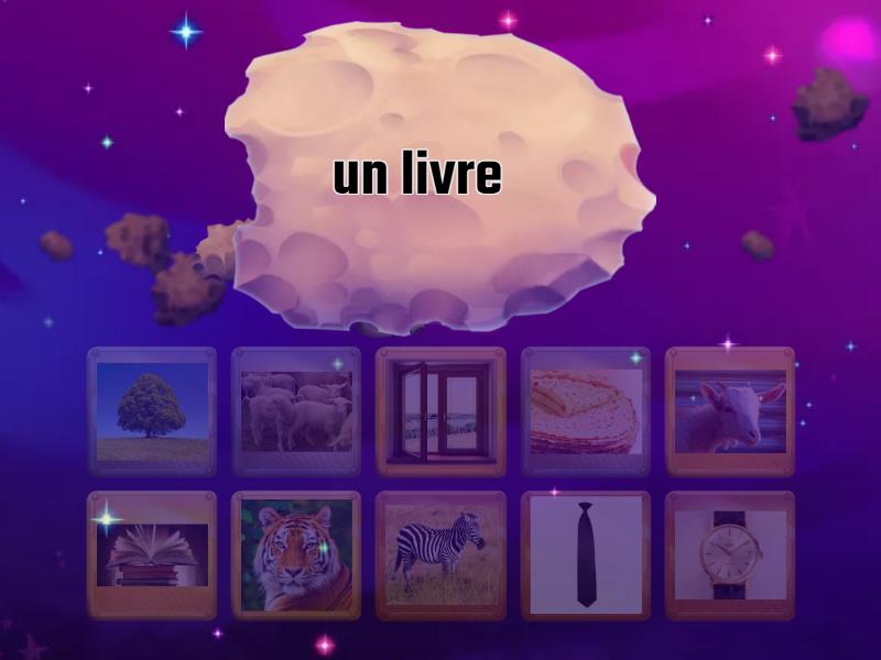 un livre , un arbre , une montre , la chèvre, des crêpes , une cravate , la fenêtre , les brebis , le zèbre, le tigre,
