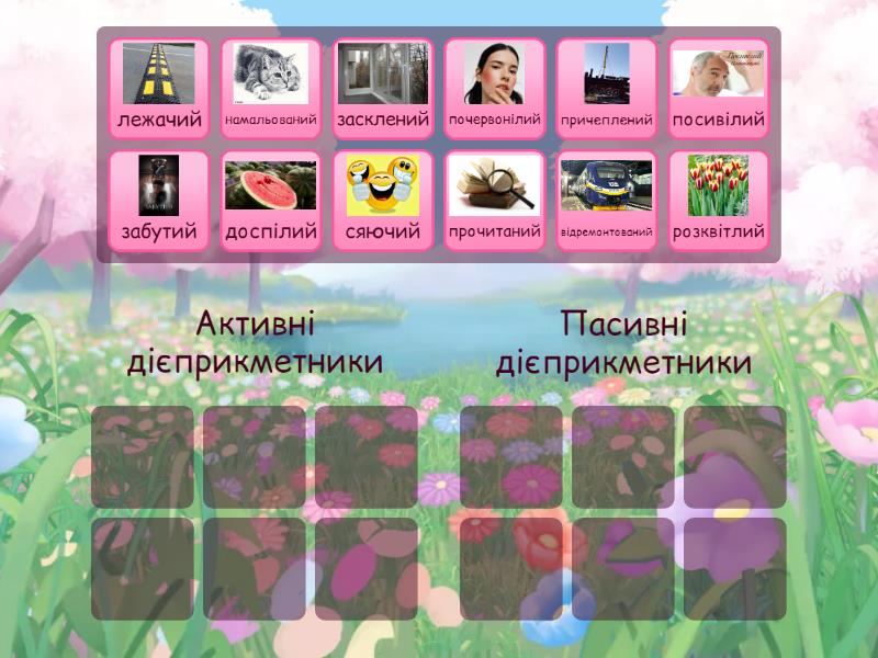 Активні дієприкметники: сяючий, лежачий, посивілий, розквітлий, доспілий, почервонілий, Пасивні дієприкметники: намальований, причеплений, забутий, відремонтований, засклений, прочитаний,