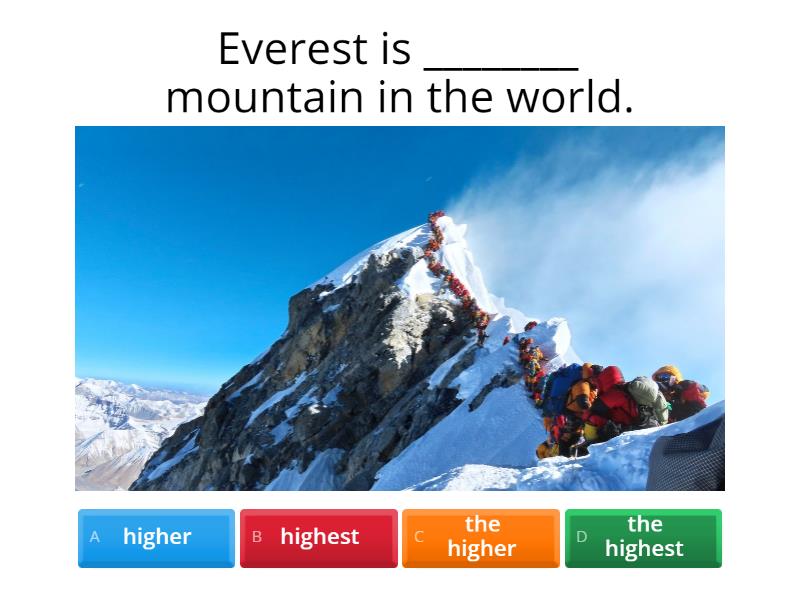 1) Everest is ________ mountain in the world. a) higher b) highest c) the higher d) the highest 2) What is _________ country in South America? a) bigger b) the bigest c) the bigger d) the biggest 3) Which is __________: emeralds or diamonds? a) expensivier b) most expensive c) the most expensive d) more expensive 4) Cheetah is _________ animal in the world. a) the fastest b) the faster c) the most fast d) the fastiest 5) Which animal is________________: scorpion or snake? a) the most dangerous b) the more dangerous c) more dangerous d) dangerouser 6) Whales are ______________ mammals in the world. a) the bigger b) bigger c) biggest d) the biggest 7) What is the __________ river in the world? a) the longer b) longest c) longer than d) the longest 8) My sister thinks she's ______ than me, but I don't agree! a) the most intelligent b) more intelligent c) intelligent d) the more intelligent 9) What is ____ month of the year in England? a) wetter b) wet c) the wettest d) the more wetter 10) Do you think the Harry Potter films are ____ than the books? a) better b) best c) the best d) more good 11)  Who is the ____ person in your country? a) most powerful b) more powerful c) powerfullest d) the most powerful 12) I think Men in Black 1 was ____ than Men in Black 3.score a) more fun b) funniest c) the most fun d) funnier 13) Is Angelina Jolie ____ than Sandra Bullock? a) older b) oldest c) the oldest d) more older 14) Keanu is _____ person that I know. a) nicer b) nicest c) the nicest d) more nice 15) This is ____ play I've ever seen. a) the most interesting b) the more interesting c) the interesting d) most interesting