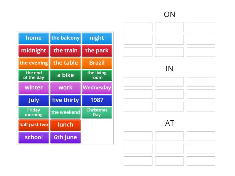 ON: 6th June, Wednesday, Christmas Day, Friday morning, a bike, the balcony, the train, the table, IN: the evening, 1987, the weekend, winter, the living room, the park, Brazil, July, AT: half past two, night, the end of the day, home, school, midnight, lunch, work, five thirty,