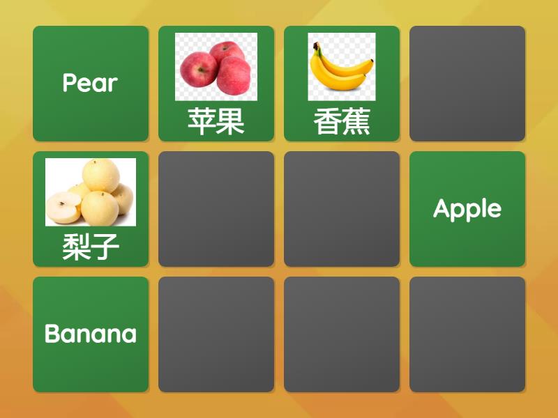 香蕉 - Banana, 梨子 - Pear, 苹果 - Apple, 葡萄 - Grape, 三角形 - Triangle, 金字塔 - Pyramid,