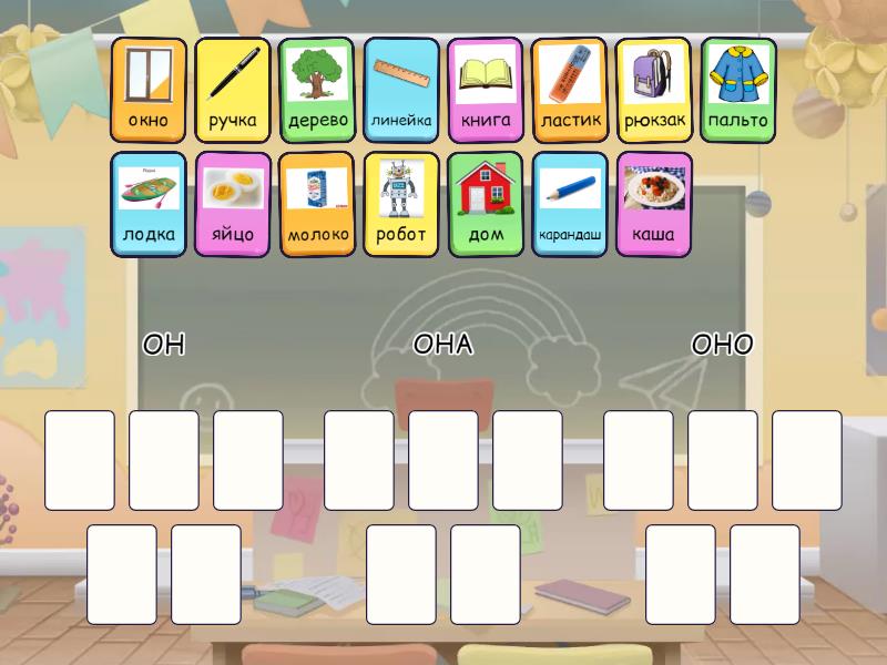 ОН: дом, рюкзак, робот, ластик, карандаш, ОНА: книга, ручка, лодка, каша, линейка, ОНО: дерево, яйцо, молоко, окно, пальто,