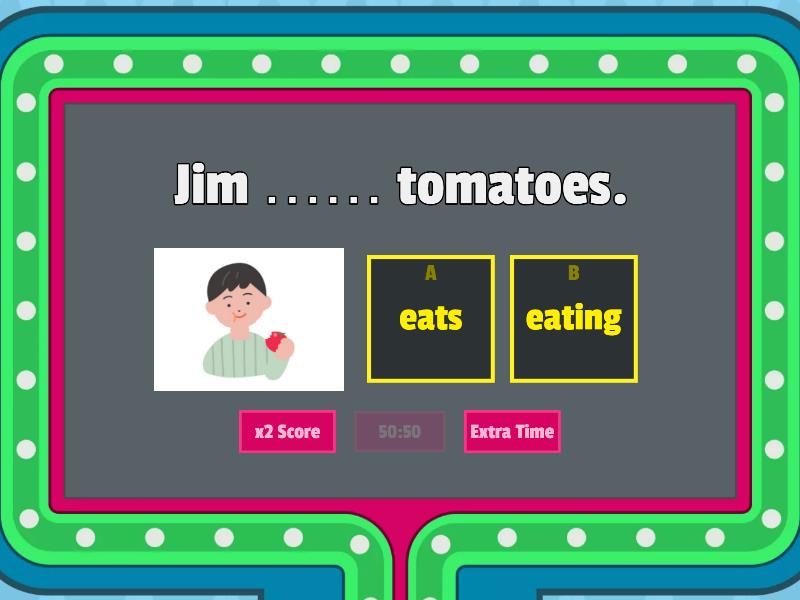 1) Jim …… tomatoes. a) eats b) eating  2) Lisa usually …… housework in the evening. a) are doing b) does 3) Tony ….. cartoon at the moment a) is watching b) watches 4) …… you …… to school every day? a) Do/go b) Is/going 5) Jame and I ……. the net now. a) am surfing b) are surfing 6) My sister never …… a bike. a) is riding b) rides 7) The train ….. right now. a) is coming b) comes 8) listen! Newtons ….. the guitar. a) plays b) is playing 9) Jessica ….. her bedroom every day a) cleans b) is cleaning 10) A: What are you doing? a) b: I dance b) b: I am dancing