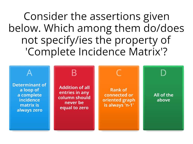 1) Consider the assertions given below. Which among them do/does not specify/ies the property of 'Complete Incidence Matrix'? a) Determinant of a loop of a complete incidence matrix is always zero b) Addition of all entries in any column should never be equal to zero c) Rank of connected or oriented graph is always 'n-1' d) All of the above 2) How many fundamental cutsets will be generated for a graph with 'n' number of nodes? a) n-1 b) n+1 c) n2(n-1) d) n/ n-1 3) What will be the number of trees, if the graph exhibits reduction in the form of reduced incident matrix given below? a) 16 b) 24 c) 28 4) What will be the value of a rectangular (complete incidence) matrix, if an associated branch is oriented towards the node? a) 1 b) -1 c) 0 d) 2 5) Inductor does not allow sudden change in ___________ a) voltage b) frequency c) current d) phase 6) If the switch is closed at t=0, what is the current in the circuit? a) Infinity b) 10 c) 0 d) 20 7) Calculate di(0)/dt if the switch is closed at t=0  a) -9.9A/s b) -10A/s c) 0A/s d) -0.1A/s
