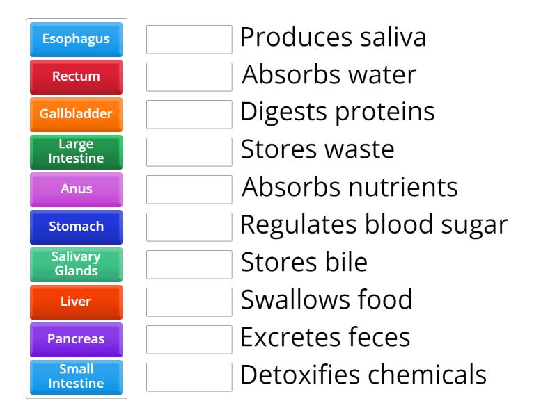 Esophagus - Swallows food, Stomach - Digests proteins, Small Intestine - Absorbs nutrients, Large Intestine - Absorbs water, Liver - Detoxifies chemicals, Gallbladder - Stores bile, Pancreas - Regulates blood sugar, Salivary Glands - Produces saliva, Rectum - Stores waste, Anus - Excretes feces,