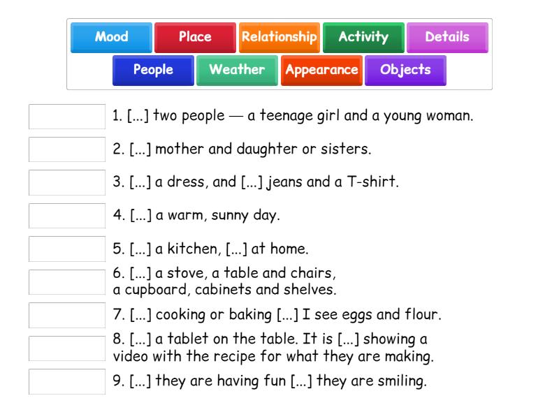 People - 1. [...] two people — a teenage girl and a young woman. , Relationship - 2. [...] mother and daughter or sisters. , Appearance - 3. [...] a dress, and [...] jeans and a T-shirt. , Weather - 4. [...] a warm, sunny day., Place - 5. [...] a kitchen, [...] at home. , Objects - 6. [...] a stove, a table and chairs, a cupboard, cabinets and shelves., Activity - 7. [...] cooking or baking [...] I see eggs and flour. , Details - 8. [...] a tablet on the table. It is [...] showing a video with the recipe for what they are making., Mood - 9. [...] they are having fun [...] they are smiling.,