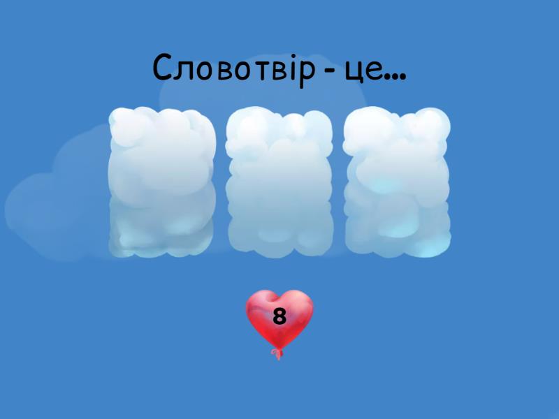 1) Словотвір - це... a) будова слова b) лексичне значення слова c) розділ, що вивчає способи й особливості творення нових слів 2) Назвіть основні способи словотворення a) суфіксальний, складання основ, абревіація, префіксальний b) перехід з однієї частини мови у іншу, безафіксний, префіксальний, префіксально-суфіксальний c) префіксальний, префіксально-суфіксальний, суфіксальний, безафіксний, складання основ, абревіація, перехід з однієї частини мови у іншу 3) Де під час творення слів суфіксальним способом відбулося чергування правильно? a) донецький - Донеччина b) харківський - Харківшчина c) вінницький - віннитчина d) серце - сердешний 4) У якому рядку слова із префіксами записані правильно? a) придорожнє, прірва, пригарний b) прибережний, преземлити, преморозити c) пребережний, приморозити, приземлити d) премилий, прикордоння, прикраса 5) Яким способом словотворення утворені слова: обсів, відпуск, наліт, переказ? a) суфіксальним b) префіксальним c) абревіацією d) безафіксним способом 6) У якому рядку всі слова утворені способом складання основ? a) холоднокровний, перекотиполе, прикраса b) багатоповерховий, мовознавець, лісостеп c) східноукраїнський, прикордонник, прізвище d) вихід, хліб-сіль, краєзнавець 7) У якому рядку всі складні слова записані правильно? a) відео-фільм, кінозал, агрокультура b) відеофільм, кінозал, агрокультура c) блок-система, жарптиця, інтернет-видання 8) У якому рядку правильно записані всі слова з пів- a) пів відра, піваркуш, півколо b) пів аркуша, пів України, пів коло c) південь, півзахист, пів коло d) пів апельсина, півоберт , пів куля 9) Абревіатури - це: a) складноскорочені слова, утворені з початкових (ініціальних) букв b) перехід слів з однієї частини мови в іншу c) нові слова d) слова утворені суфіксальним способом 10) Оберіть рядок, де всі слова будуть утворені способом переходу слів з однієї частини мови у іншу. a) молода вишня - молода на весіллі, старий дуб- старий увійшов до хати b) розпис, безвідповідальний, безхмарний c) превисокий, безсовісний, неправда d) ЗСУ, МОН, МВФ