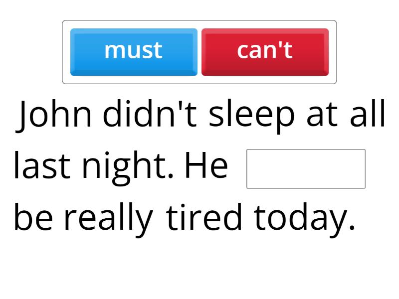 John didn't sleep at all last night. He ____ be really tired today. Where's Lidia? She ____ be at work today because her office is closed. Let's try that store over there. It ____ be cheaper, but I'm not sure. We ____ be at the right address. There's no restaurant here. A - Is Vicky's husband Australian? ; B - He ____be, but I've never asked him. I never see Max studying, so he ____ be a very good student. Look, Brian ____ be home - the lights are on in his apartment. This ____ be the museum Lucy was talking about. I'm absolutely sure. That movie won three Oscars, so it ____ be really good. The people on the street have opened their umbrellas, so it ____ be raining.