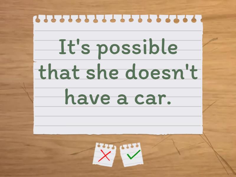 I'm sure they don't live here. - They can't live here., Maybe, they are asleep. - They might/could be asleep., Perhaps, he works at a library. - He might/could work at a library., I'm sure she is on holiday. - She must be on holiday., It's possible that they live abroad. - They might/could live abroad., I'm sure he will come home soon. - He must come home soon., It's possible that she doesn't have a car. - She might/could not have a car., Perhaps we will go to Italy next summer. - We might/could go to Italy next summer., I'm sure that George isn't at the party. - George can't be at the party., Maybe, the guests will arrive at 9 p.m. - The guests might/could arrive at 9 p.m.,