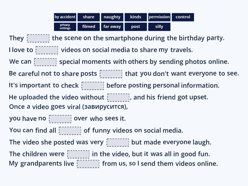 They ____ the scene on the smartphone during the birthday party. I love to ____ videos on social media to share my travels. We can ____ special moments with others by sending photos online. Be careful not to share posts ____ that you don't want everyone to see. It's important to check ____ before posting personal information. He uploaded the video without ____, and his friend got upset. Once a video goes viral (завирусится), you have no ____ over who sees it. You can find all ____ of funny videos on social media. The video she posted was very ____ but made everyone laugh. The children were ____ in the video, but it was all in good fun. My grandparents live ____ from us, so I send them videos online.