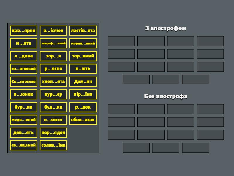 З апострофом: Дем..ян, обов..язок, п..ють, тор..яний, м...ята, пір...їна, кав...ярня, дев...ять, хлоп...ята, солов...їна, ластів..ята, в...юнок, п...ятсот, жираф....ячий, кур...єр, Без апострофа: р...ясно, бур...як, зор...я, моркв...яний, буд...як, л...дина, св...ятковий, в...іслюк, пор...ядок, св...ящений, р...док, Св...ятослав, медв...яний,