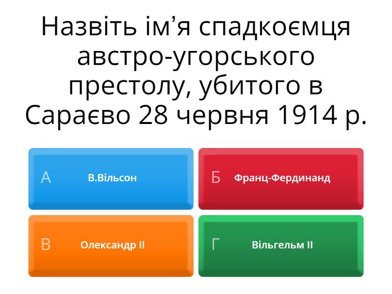 1) Назвіть ім’я спадкоємця австро-угорського престолу, убитого в Сараєво 28 червня 1914 р. a) В.Вільсон b) Франц-Фердинанд c) Олександр ІІ d) Вільгельм ІІ 2) Які битви відбулися у 1916 році? a) Галицька, Ютландська, Верденська b) Ютландська, Верденська, на річці Соммі c) на річці Соммі, друга битва на річці Марні, битва під Ам'єном d) перша битва а річці Марні, Галицька, Брусилівський прорив 3) Цілковите або часткове фізичне знищення окремих груп населення за расовими, національними, етнічними чи релігійними ознаками. Один з найтяжчих міжнародних злочинів. a) шовінізм b) геноцид c) колабораціонізм d) ксенофобія 4) Брусиловський прорив - це... a) підводна блокада Німеччиною Англії b) наступальна операція російської армії проти австро-угорських і німецьких військ c) розгром німецьких військ французькими військами під командуванням Ф.Фоша 5) Як називають насильницьке приєднання, захоплення, утримання однією державою території іншої? a) контрибуція b) санкції c) анексія d) репарація 6) Де вперше під час Першої світової війни було використало отруйні гази? a) під час битви під Верденом b) у битві на річці Сомма c) у першій битві на річці Марна d) під час військової операції біля річки Іпр 7) Повне або часткове відшкодування державою завданих нею збитків іншій або іншим державам. Передбачається у мирних договорах. a) Репатріація b) Реконструкція c) Реставрація d) Репарація 8) Коли була Перша світова війна? a) 1914-1916 рр. b) 1914-1919 рр. c) 1914 - 1918 рр. d) 1914 - 1920 рр. 9) Хто був начальником генерального штабу Німеччина на початку війни(розрорив плану нападу) a) фон Гінденбург b) фон Шліффен c) фон Мольтке d) Е.Люндерндорф
