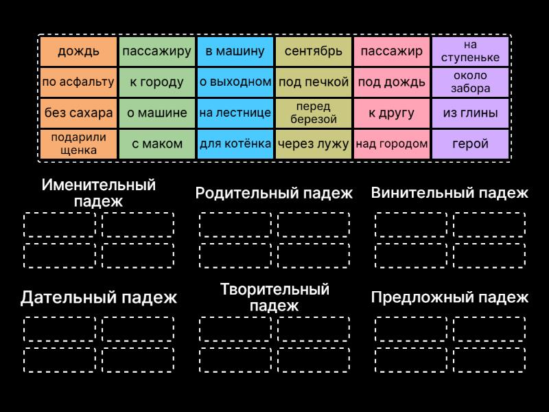Именительный падеж: пассажир, дождь, сентябрь, герой, Родительный падеж: около забора, без сахара, для котёнка, из глины, Винительный падеж: под дождь, в машину, подарили щенка, через лужу, Дательный падеж: к городу, по асфальту, пассажиру, к другу, Творительный падеж: с маком, перед березой, над городом, под печкой, Предложный падеж: на ступеньке, о выходном, на лестнице, о машине,