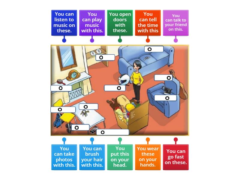 You can brush your hair with this., You can go fast on these., You wear these on your hands., You open doors with these., You can talk to your friend on this., You can listen to music on these., You put this on your head., You can tell the time with this, You can play music with this., You can take photos with this..