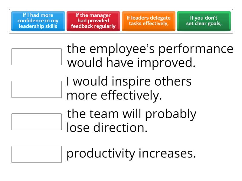 If leaders delegate tasks effectively, - productivity increases., If you don't set clear goals, - the team will probably lose direction., If I had more confidence in my leadership skills - I would inspire others more effectively., If the manager had provided feedback regularly - the employee’s performance would have improved.,