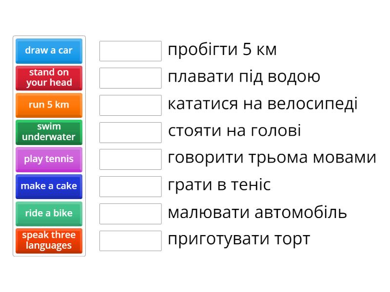 draw a car - малювати автомобіль, make a cake - приготувати торт, play tennis - грати в теніс, ride a bike - кататися на велосипеді, run 5 km - пробігти 5 км, speak three languages - говорити трьома мовами, stand on your head - стояти на голові, swim underwater - плавати під водою,