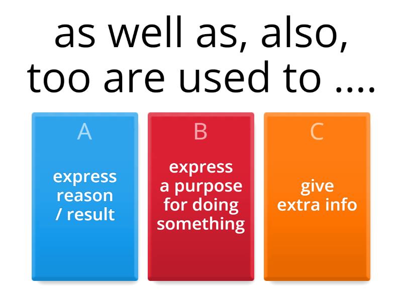 1) as well as, also, too are used to .... a) express reason / result b) express a purpose for doing something c) give extra info 2) while, although, still, despite, however, even though are used to .... a) give extra info b) contrast information c) express reason / result 3) so that, to, in order to are used to .... a) give extra info b) contrast information c) express a purpose for doing 4) so, that's why, since, as, because are used to .... a) express reason / result b) express reason / result c) contrast information 5) I applied for the job. ....., I didn't get it, unfortunately. a) However b) although c) in order to 6) ..... I am more than qualified for the job, I didn't even get an interview a) despite b) Although c) In order to 7) I love travelling. ... the work was perfect for me. a) That's why b) Although c) Despite 8) I think the reason I didn't get the job was my poor Spanish ...I have enrolled on a beginners' course. a) So b) In order to c) However 9) I am trying to improve my French, ....... learning Spanish. a) depite b) in order to c) as well as 10) .....the high salary I was offered, I decided to turn down the job. a) Despite b) However c) Although 11) ...... improve my vocabulary, I am watching French films. a) Depite b) So  c) In order to 12) I enjoyed my time at the law firm. I made a lot of friends there.... a) too b) As well as c) however