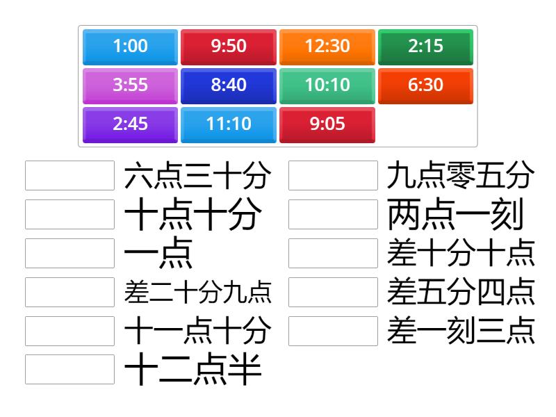 12:30 - 十二点半, 3:55 - 差五分四点, 6:30 - 六点三十分, 2:45 - 差一刻三点, 2:15 - 两点一刻, 9:05 - 九点零五分, 10:10 - 十点十分, 9:50 - 差十分十点, 8:40 - 差二十分九点, 11:10 - 十一点十分, 1:00 - 一点,
