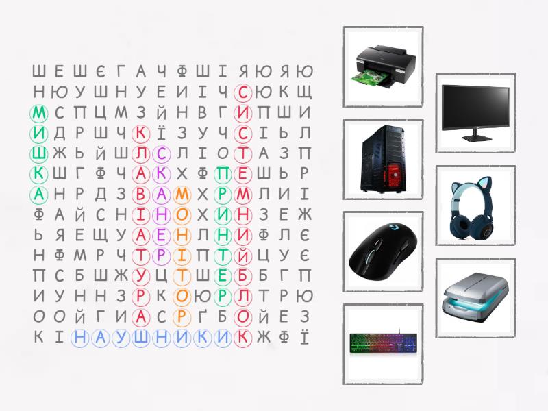 Клавіатура, Мишка, Монітор , Сканер , Наушники , Системнийблок , Принтер ,