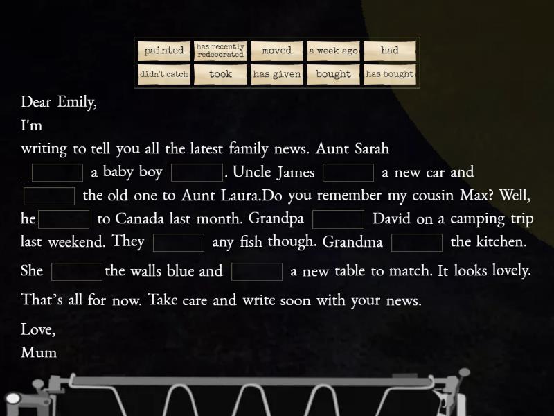 Dear Emily, I'm writing to tell you all the latest family news. Aunt Sarah _____ a baby boy ____. Uncle James ____ a new car and ____ the old one to Aunt Laura.Do you remember my cousin Max? Well, he____ to Canada last month. Grandpa ____ David on a camping trip last weekend. They ____ any fish though. Grandma ____ the kitchen. She ____the walls blue and ____ a new table to match. It looks lovely. That’s all for now. Take care and write soon with your news. Love, Mum