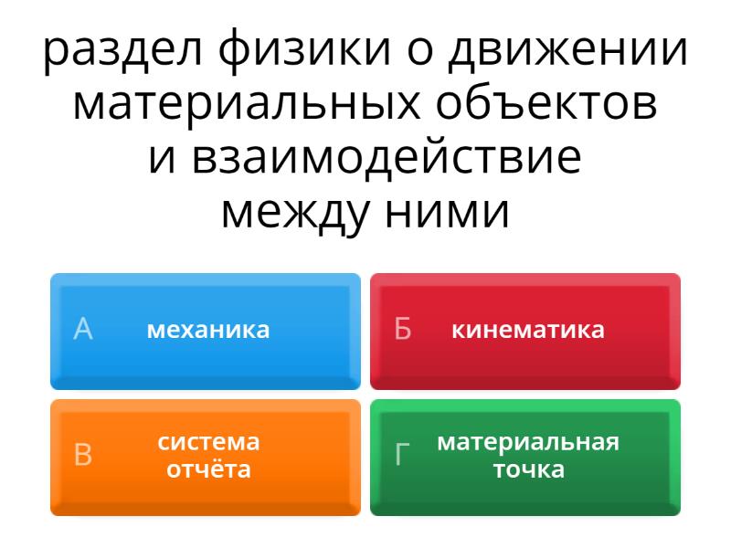 1) раздел физики о движении материальных объектов и взаимодействие между ними a) механика b) кинематика c) система отчёта d) материальная точка 2) тело размерами и формами которого в условиях данной задачей можно принибречь a) механическое движение тела b) материальная точка c) система отчет d) механика 3) Это изменение положение тела в пространстве относительно других тел с течением времени a) система отчета b) механика c) кинематика d) механическое движение тела 4) это раздел механики в котором движение тел рассматривается без выяснения этого движения a) система отчета b) кинематика c) материальная точка d) механика 5) это движение при котором тело за любые равные промежутки времени совершает одинаковые перемещения a) радиус b) средняя скорость c) ускорение d) прямолинейное равномерное движение