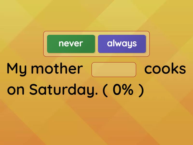 My mother ____ cooks on Saturday. ( 0% ) My grandpa ____ uses an alarm clock. (100% ) Karina and Mark ____ go to the park. (25%) Elena ____ sings in the shower. ( 75 % ) I ____study after class. ( 50 % ) Marco ____ goes to bed late. ( 50% ) Paula ____ eats cereal for breakfast. ( 0% )