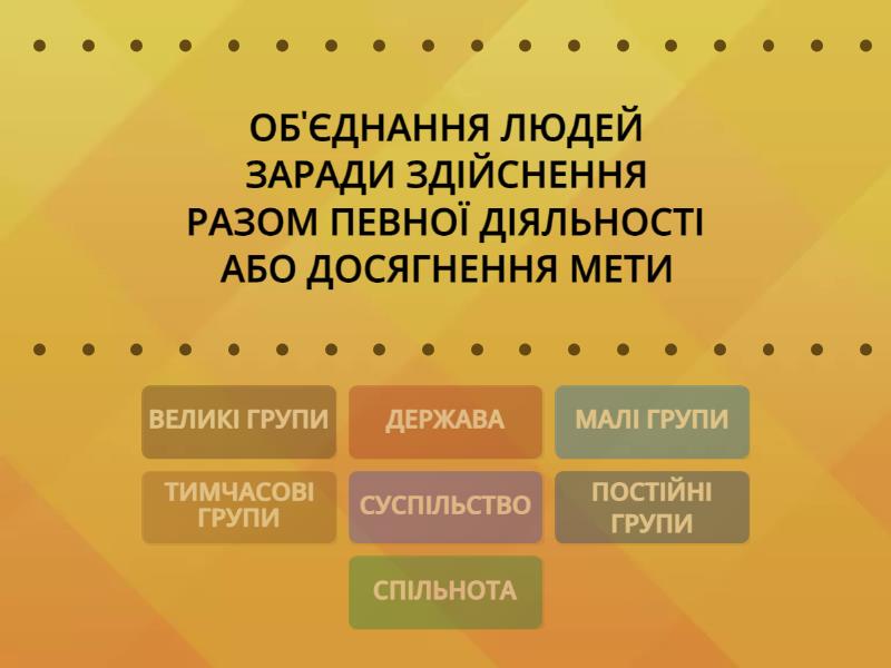 СПІЛЬНОТА - ОБ'ЄДНАННЯ ЛЮДЕЙ ЗАРАДИ ЗДІЙСНЕННЯ РАЗОМ ПЕВНОЇ ДІЯЛЬНОСТІ АБО ДОСЯГНЕННЯ МЕТИ , СУСПІЛЬСТВО - СУКУПНІСТЬ СПІЛЬНОТ, ЩО ВЗАЄМОДІЮТЬ МІЖ СОБОЮ, ДЕРЖАВА - ФОРМА ОРГАНІЗАЦІЇ ЖИТТЯ ЛЮДСЬКИХ СПІЛЬНОТ, ЯКА ХАРАКТЕРИЗУЄТЬСЯ НАЯВНІСТЮ СИСТЕМИ ОРГАНІВ ВЛАДИ, ЗАКОНІВ, ВИЗНАЧЕНОЇ ТЕРИТОРІЇ ТОЩО, МАЛІ ГРУПИ - СПІЛЬНОТИ, У ДІЯЛЬНОСТІ ЯКИХ КОЖНА ЛЮДИНА БЕРЕ АКТИВНУ УЧАСТЬ, ВЕЛИКІ ГРУПИ - ЦІ ГРУПИ ВИДІЛЯЮТЬ ЗА ПЕВНИМИ ОЗНАКАМИ- СТАТЬ, ВІК, ДОХІД, НАЦІОНАЛЬНІСТЬ, МІСЦЕ ПРОЖИВАННЯ, ОСВІТА, ПРОФЕСІЯ, ПОСТІЙНІ ГРУПИ - ЧЛЕНИ ГРУП ОБ'ЄДНАНІ СПІЛЬНИМИ ІНТЕРЕСАМИ І ТРИВАЛИЙ ЧАС СПІЛКУЮТЬСЯ МІЖ СОБОЮ, ТИМЧАСОВІ ГРУПИ - ВИНИКАЮТЬ ПІД ЧАС ПЕВНИХ ЖИТТЄВИХ СИТУАЦІЙ,