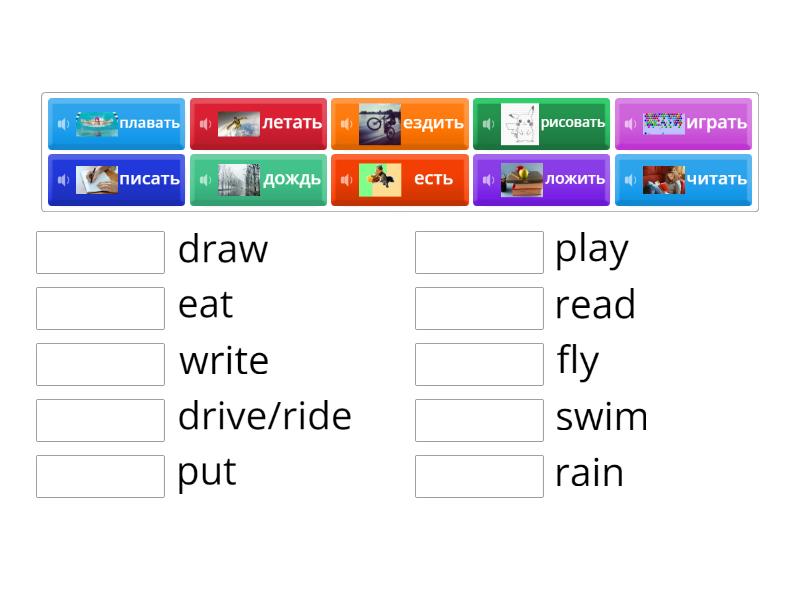 играть - play, летать - fly, дождь - rain, писать - write, читать - read, ездить - drive/ride, есть - eat, ложить - put, рисовать - draw, плавать - swim,