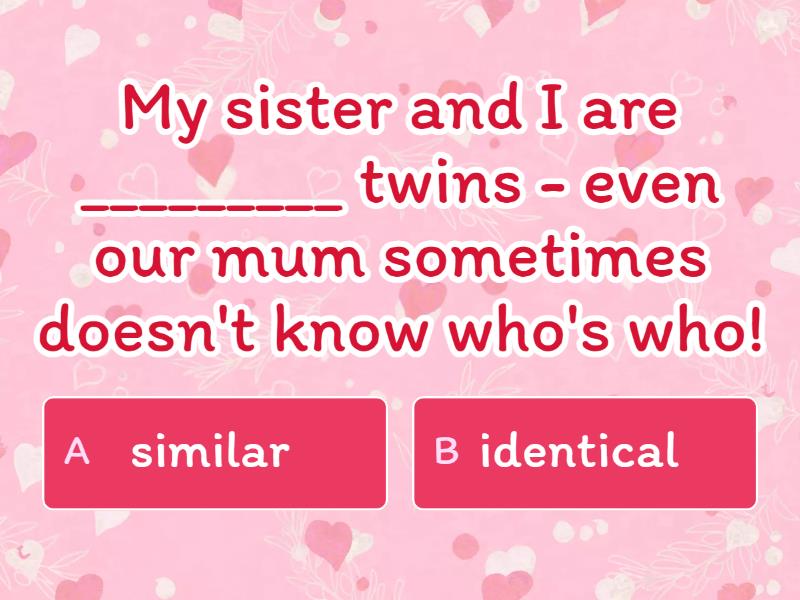 1) My sister and I are _________ twins - even our mum sometimes doesn't know who's who! a) similar b) identical 2) I have the same colour eyes ______ my dad. a) as b) that 3) My brother and I are _________ in a band. I'm a guitarist and he's a drummer. a) both b) same 4) My cousin and I are quite _________, but she's taller than me. a) similar b) identical 5) Do you look _________ your mother? a) like b) as 6) When we went back to the house where we used to live, it seemed very different _________ how I remembered it. a) from b) as
