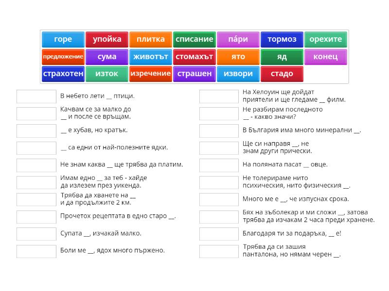 предложение - Имам едно __ за теб - хайде да излезем през уикенда., изречение - Не разбирам последното __ - какво значи?, изток - Трябва да хванете на __ и да продължите 2 км., извори - В България има много минерални __., стомахът - Боли ме __, ядох много пържено., животът - __ е хубав, но кратък. , горе - Качвам се за малко до __ и после се връщам., сума - Не знам каква __ ще трябва да платим., орехите - __ са едни от най-полезните ядки., яд - Много ме е __, че изпуснах срока., страхотен - Благодаря ти за подаръка, __ е!, страшен - На Хелоуин ще дойдат приятели и ще гледаме __ филм., упойка - Бях на зъболекар и ми сложи __, затова трябва да изчакам 2 часа преди хранене., конец - Трябва да си зашия панталона, но нямам черен __., пáри - Супата __, изчакай малко., ято - В небето лети __ птици., плитка - Ще си направя __, не знам други прически., стадо - На поляната пасат __ овце., списание - Прочетох рецептата в едно старо __., тормоз - Не толерираме нито психическия, нито физическия __.,
