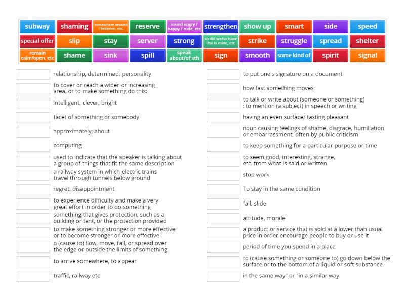 remain calm/open, etc - To stay in the same condition, reserve - to keep something for a particular purpose or time, server - computing, shame - regret, disappointment, shaming - noun causing feelings of shame, disgrace, humiliation or embarrassment, often by public criticism, shelter - something that gives protection, such as a building or tent, or the protection provided, show up - to arrive somewhere, to appear, side - facet of something or somebody, sign - to put one’s signature on a document, signal - traffic, railway etc, sink - to (cause something or someone to) go down below the surface or to the bottom of a liquid or soft substance, slip - fall, slide, smart - Intelligent, clever, bright, smooth - having an even surface/ tasting pleasant, so did we/so have I/so is mine, etc - in the same way" or "in a similar way, some kind of - used to indicate that the speaker is talking about a group of things that fit the same description, somewhere around / between, etc. - approximately; about, sound angry / happy / rude, etc - to seem good, interesting, strange, etc. from what is said or written, speak about/of sth - to talk or write about (someone or something) : to mention (a subject) in speech or writing, special offer - a product or service that is sold at a lower than usual price in order encourage people to buy or use it, speed - how fast something moves, spill - o (cause to) flow, move, fall, or spread over the edge or outside the limits of something, spirit - attitude, morale, spread - to cover or reach a wider or increasing area, or to make something do this:, stay - period of time you spend in a place, strengthen - to make something stronger or more effective, or to become stronger or more effective, strike - stop work, strong - relationship; determined; personality, struggle - to experience difficulty and make a very great effort in order to do something, subway - a railway system in which electric trains travel through tunnels below ground,