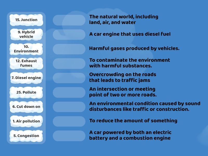 1. Air pollution - An environmental condition caused by sound disturbances like traffic or construction., 3. Carpooling   - The practice of sharing a car journey with others to reduce traffic and pollution, 5. Congestion   - Overcrowding on the roads that leads to traffic jams, 6. Cut down on   - To reduce the amount of something, 7. Diesel engine   - A car engine that uses diesel fuel, 8. Electric vehicle   - A type of vehicle that runs solely on electricity, 9. Hybrid vehicle   - A car powered by both an electric battery and a combustion engine, 10. Environment   - The natural world, including land, air, and water, 12. Exhaust fumes   - Harmful gases produced by vehicles., 15. Junction   - An intersection or meeting point of two or more roads., 16. Knock down   - To collide with and injure a pedestrian using a vehicle., 17. Motorway   - A large, major road designed for fast traffic., 18. Obey   - To follow the rules or commands given, especially regarding traffic, 20. One-way system   - A system where all vehicles must move in one direction., 25. Pollute   - To contaminate the environment with harmful substances., 26. Renewable energy   - Energy sources like solar or wind that can be replenished naturally., 27. Run over   - To hit and drive over someone or something with a vehicle.,