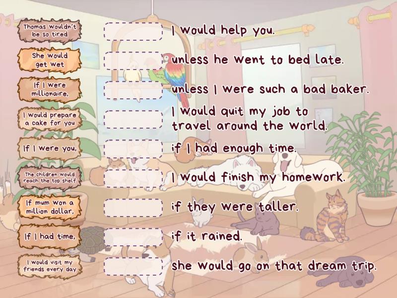 If I were you, - I would finish my homework., If mum won a million dollar, - she would go on that dream trip., She would get wet - if it rained., Thomas wouldn´t be so tired - unless he went to bed late., The children would reach the top shelf - if they were taller., I would prepare a cake for you - unless I were such a bad baker., If I had time, - I would help you., If I were millionaire, - I would quit my job to travel around the world., I would visit my friends every day - if I had enough time.,