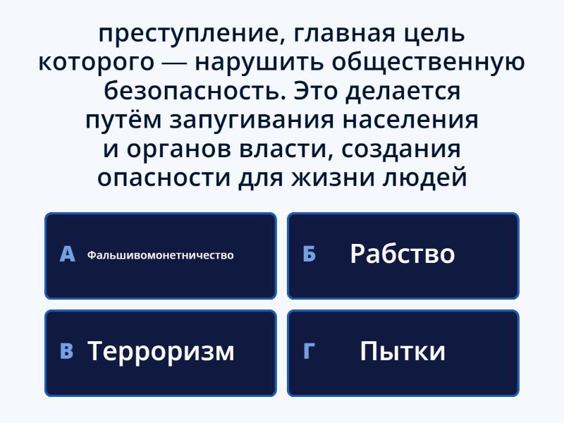 1) преступление, главная цель которого — нарушить общественную безопасность. Это делается путём запугивания населения и органов власти, создания опасности для жизни людей a) Фальшивомонетничество b) Рабство c) Терроризм d) Пытки 2) незаконное овладение воздушным судном (чаще всего самолётом) одним или несколькими лицами a) Терроризм b) Захват воздушного судна c) Пытки d) Пиратство 3) изготовление и распространение поддельных денег или ценных бумаг с целью обмана или получения прибыли a) Фальшивомонетничество b) Незаконный оборот наркотических веществ c) Посягательство на культурные ценности d) Захват воздушного судна 4) противоправная деятельность, связанная с разработкой, производством, изготовлением, переработкой, хранением, перевозкой, пересылкой таких веществ без специального разрешения уполномоченных государственных органов a) Незаконный оборот наркотических веществ b) Пиратство c) Терроризм d) Рабство 5) это незаконное действие, направленное на причинение ущерба или уничтожение культурных ценностей a) Рабство b) Пытки c) Пиратство d) Посягательство на культурные ценности 6) использование принудительного труда, эксплуатации и ограничения свободы человека в преступных целях a) Терроризм b) Фальшивомонетничество c) Рабство d) Посягательство на культурные ценности 7) умышленное причинение человеку сильной боли или страданий по причинам, включающим наказание, выбивание признания, допрос с целью получения информации или запугивание третьих лиц a) Пытки b) Пиратство c) Рабство d) Незаконный оборот наркотических веществ 8) незаконный захват, ограбление или потопление гражданских морских и воздушных суд a) Незаконный оборот наркотических веществ b) Терроризм c) Пиратство d) Фальшивомонетничество