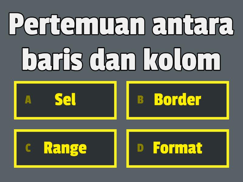 1) Pertemuan antara baris dan kolom a) Sel b) Border c) Range d) Format 2) Kumpulan dari beberapa sel yang bisa dibentuk dalam satu baris, dalam satu kolom bahkan gabungan antara kolom dan baris a) Bold b) Format c) Range d) Sel 3) Untuk memindahkan satu sel kebawah menekan tombol keyboard.. a) Enter b) Home c) PgUp d) Alt+PgDn 4) Lembar kerja pada Microsoft Excel disebut.. a) Spreadsheets b) Worksheet c) Border d) Layout 5) Untuk memberi garis pada Excel menggunakan perintah.. a) Border b) Format c) Font d) Layout 6) Perintah Column Width berguna untuk a) Mengatur lebar kolom b) Mengatur lebar sel c) Mengatur lebar baris  d) Mengatur lebar range 7) Untuk menggabungkan sel menggunakan perintah a) Bold b) Merge and center c) Move or copy d) Create a copy 8) Untuk mengganti warna menggunakan perintah a) Border b) Fill Color c) Row Height d) Cell pointer 9) Perintah untuk menghapus baris/kolom dilakukan dengan mengklik kanan pada mouse dinamakan a) Cut b) Copy c) Delete d) Paste 10) Cara untuk menduplikat lembar kerja menggunakan perintah a) Block range, copy dan paste b) Block sel, copy dan paste c) Klik sel, copy dan paste d) klik range, copy dan paste