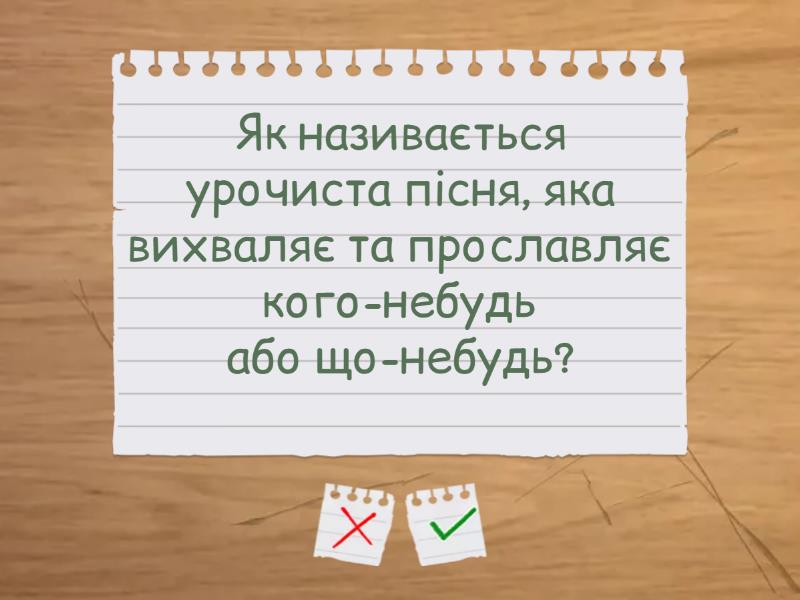 Який вид перекладу відтворює зміст оригіналу в повному обсязі? - Повний переклад, Як називаються народні ліричні твори, у яких зображено різні аспекти суспільного життя? - Соціально-побутові пісні, Ідеєю якої пісні є уславлення мужності, відваги Дорошенка, Сагайдачного, козацького війська? - "Ой на горі та женці жнуть", Темою якої пісні є зображення драматизму мандрівного способу життя чумаків? - "Ой горе тій чайці", Яка пісня стала гімном єврейського народу, символом його стійкості та життєлюбства - "Хава Наґіла", Що означає вислів "Хава Нагіла"? - Радіймо, Який поет є автором поезії «Травнева пісня»? - Йоганн Вольфганг Ґете, Яка пісня 1999 року пісня була використана як саундтрек у польському фільмі «Вогнем і мечем»? - "Гей, соколи", Хто написав музику до вірша Богдана Лепкого «Журавлі»? - Левко Лепкий, Яка інша назва пісні Богдана Лепкого "Журавлі"? - "Видиш, брате мій", Яка пісня написана за мотивами останнього куплету козацької пісні XVII століття «Розлилися круті бережечки»? - «Ой у лу́зі черво́на кали́на…», Яка пісня стала славнем УСС? - «Ой у лу́зі черво́на кали́на…», Яку пісню ОУН обрала своїм офіційним славнем? - «Зродились ми великої години…», Кому Микола Матола присвятив поезію «Мій друже Ковалю…»? - «Карпатській Січі» та воїнам УПА, З якої пісні рядки "Поки спокою не має, кожен метр твого краю, і невзята кожна твоя висота»? - "Квіти мінних зон", З якою піснею гурт «Kalush Orchestra» 15 травня 2022 року виграв «Євробачення-2022»? - "Стефанія", Як називається різновид соціально-побутових пісень про боротьбу за українську державність Українських січових стрільців? - Стрілецькі пісні, Як називається пісня, що має автора? - Літературна, Як називається стилістичний прийом, що полягає в повторенні тих самих звуків, слів, речень на початку двох або кількох суміжних рядків, строф, фраз? - Анафора, Як називається урочиста пісня, яка вихваляє та прославляє кого-небудь або що-небудь? - Гімн ,