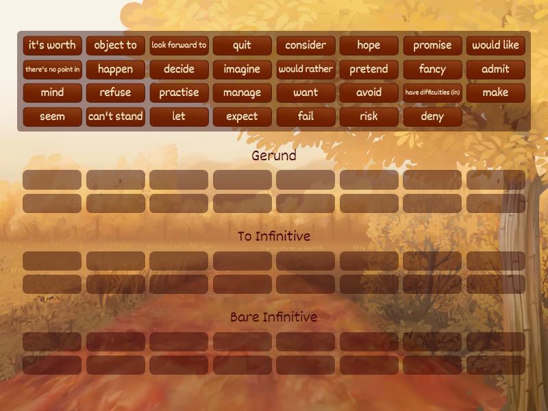 Gerund: admit , avoid, consider, deny, fancy, imagine, mind, practise, quit, have difficulties (in), can't stand, object to, look forward to, there's no point in, it's worth, risk, To Infinitive: expect, decide, fail, happen, seem, manage, promise, refuse, pretend, hope, would like, want, Bare Infinitive: let, would rather, make,