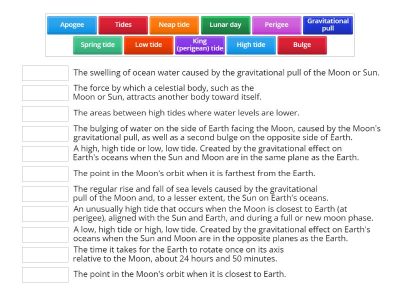 High tide - The bulging of water on the side of Earth facing the Moon, caused by the Moon’s gravitational pull, as well as a second bulge on the opposite side of Earth., Low tide - The areas between high tides where water levels are lower., Spring tide - A high, high tide or low, low tide. Created by the gravitational effect on Earth's oceans when the Sun and Moon are in the same plane as the Earth., Neap tide - A low, high tide or high, low tide. Created by the gravitational effect on Earth's oceans when the Sun and Moon are in the opposite planes as the Earth., King (perigean) tide - An unusually high tide that occurs when the Moon is closest to Earth (at perigee), aligned with the Sun and Earth, and during a full or new moon phase., Tides - The regular rise and fall of sea levels caused by the gravitational pull of the Moon and, to a lesser extent, the Sun on Earth’s oceans., Gravitational pull - The force by which a celestial body, such as the Moon or Sun, attracts another body toward itself., Lunar day - The time it takes for the Earth to rotate once on its axis relative to the Moon, about 24 hours and 50 minutes., Perigee - The point in the Moon's orbit when it is closest to Earth., Bulge - The swelling of ocean water caused by the gravitational pull of the Moon or Sun., Apogee - The point in the Moon's orbit when it is farthest from the Earth.,