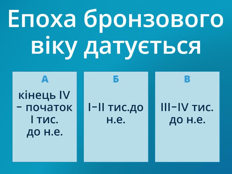 1) Епоха бронзового віку датується a) кінець ІV - початок I тис. до н.е. b) І-ІІ тис.до н.е. c) ІІІ-ІV тис. до н.е. 2) Назвіть основний матеріал,  з якого виготовляли знаряддя праці в ІV-І тис.до н.е. a) камінь b) мідь c) бронза 3) Кочовий спосіб життя вели люди, які займалися a) землеробством b) скотарством c) ремеслом 4) В епоху бронзи починає розвиватися торгівля a) так b) ні 5) Бронзова доба - це період другого суспільного поділу праці a) так b) ні 6) Третій суспільний поділ праці - це a) відокремлення землеробства від скотарства b) Відокремлення торгівлі c) перехід від привласнювального до відтворювального типу господарювання 7) Ієрархія - це a) поділ суспільства на вищі та нижчі соціальні групи b) обов'язкові платежі, які держава стягує із населення в обмін на захист та допомогу 8) Монарх - це a)  верховний правитель, який передає владу у спадок молодшим членам родини b) спілкувалися з вищими силами, були хранителями традицій і знань. c) займалися землеробством, вирощували жито, ячмінь, кукурудзу.