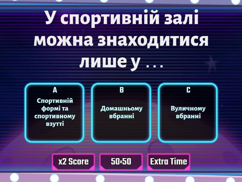 1) У спортивній залі можна знаходитися лише у … a) Спортивній формі та спортивному взутті b) Домашньому вбранні c) Вуличному вбранні 2) Особа, яка контролює виконання правил під час гри … a) Спостерігач b) Суддя c) Експерт зі спорту 3) Де зображена швидкість? a) b) c) 4) Що таке загартовування організму? a) Дуже тепло одягатись літом b) Здорова їжа c) Спеціальне тренування терморегуляторних процесів організму 5) Де зображена спритність? a) b) c) 6) Як ти вважаєш, чому треба дотримуватись дистанції під час бігу у колоні по одному? a) Дистанції не треба дотримуватись, для того щоб можна було один одного штовхати та бавитися! b) Для того, аби не травмуватися під час руху та кожному було достатньо місця д 7) Де зображена сила? a) b) c) 8) Як ти вважаєш, питний режим це важлива складова під час занять спортом? a) Так, тому що мій організм потребує більше вологи коли я займаюсь фізичними вправами. b) Ні, я вважаю що вода не особливо важлива під час занять фізичною культурою. 9) Де зображена гнучкіть? a) b) c) 10) Учні можуть займатись фізичною культурою коли: a) Їм дозволили батьки b) Пройшли медогляд c) Коли захотіли учні 11) На твою думку, важливо дотримуватися режиму дня, сну та відпочинку, правильно харчуватись та займатися спортом? a) Ні, я так не вважаю b) Не завжди c) Так, це важливо для здоров'я 12) Під час рухливих ігор, учень зобов'язаний: a) Порушувати правила гри b) Штовхатись c) Дотримуватись правил гри та безпеки 13) Що включає в себе поняття «рухливі ігри»? a) Активні рухові дії без правил b) Розвиток духовних сил c) Активна рухлива діяльність дітей, для якої характерні творчі рухливі дії, мотивовані її сюжетом 14) При заняттях фізичною культурою вдома повинно бути: a) Чисто, провітрено, зайві речі прибрані b) Брудно, жарко, зайві речі розкидані 15) Оберіть вислів, який найбільше підходить для здорового способу життя a) У кого що болить, той про те і гомонить b) У здоровому тілі, здоровий дух c) Добре діло - роби сміло