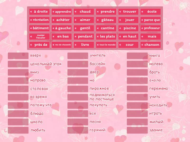 école - школа, aimer - любить, professeur - учитель, gentil - милый, pendant - во время, récréation - перемена, jouer - играть, cour - двор, cantine - столовая, les plats - блюда, chaud - горячий, trouver - находить, mais - но, parce que - потому что, tout le monde - все, près de - около, bâtiment - здание, piscine - бассейн, rez-de-chaussée - цокольный этаж, monter l'éscalier - подниматься по лестнице, à gauche - налево, à droite - направо, en bas - вниз, en haut - вверх, livre - книга, prendre - брать, achèter - покупать, chanson - песня, apprendre - учить, gâteau - пирожное,
