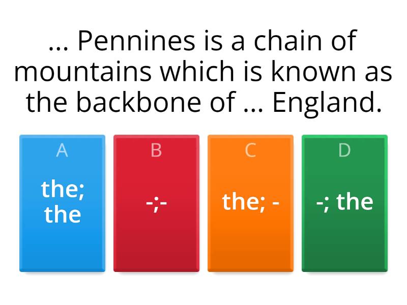 1) ... Pennines is a chain of mountains which is known as the backbone of ... England. a) the; the b) -;- c) the; - d) -; the 2) The longest river in ... United States is ... Mississippi. a) the; the b) -;- c) the; - d) -; the 3) He works somewhere in ... Southern Africa. a) the b) - 4) The cost of living in ... Sweden is higher than in the other countries of ... Europe. a) the; the b) -;- c) the; - d) -; the 5) Did you go to ... Black Sea or to ... Volga? a) the; the b) -;- c) the; - d) -; the 6) ... Urals are not very high. a) the b) - 7) Both ... North America and ... South America are washed by ... Atlantic Ocean. a) the; -; the b) the; the; - c) -; the; - d) -; -; the 8) It's in ... Tasman Sea. a) - b) the 9) Can you ski on ... Mont Blanc? a) - b) the 10) Sport has long been a priority for ... Belarus. a) the b) - 11) ... Lake Naroch is the largest lake in ... Belarus. a) the; the b) the; - c) -; - d) -; the 12) ... Svityaz is one of the most beautiful lakes. a) the b) - 13) ... Scotland is located in the north of ... Great Britain. a) the; the b) -; - c) -; the d) the; - 14) People from ... Europe like travelling to ... United States. a) the; - b) -; - c) -; the d) the; the 15) The most important river in ... UK is probably ... Thames. a) -; - b) the; the c) the; - d) -; the 16) He lives near ... Lake Ontario. a) the b) - 17) ... Prague is the capital of ... Czech Republic. a) -; the b) the; the c) the; - d) -; - 18) When I was in ... England, I visited ... Tower of London. a) the; the b) -; - c) the; - d) -; the 19) ... Rhine is a river that goes through ... Netherlands. a) the; - b) -; - c) the; the d) -; the 20) On my trip in ... Asia, I had a chance to visit ... Mount Aso and ... Yangtze River in ... China. a) the; the; the; the b) -; -; the; - c) -; the; the; - d) the; -; the; - 21) ... Mohave Desert is located in ... United States. a) the; the b) -; - c) -; the d) the; - 22) ... Appalachian Mountains are in ... North America. a) -; - b) the; - c) the; the d) -; the 23) When I was in ... New York, I visited ... Empire State Building and ... Seneca Lake. a) -; the; - b) the; the; the c) -; -; the d) the; the; - 24) ... Sea of Japan is located between ... Japan and ... South Korea. It is part of ... Pacific Ocean. a) -; -; the; the b) the; -; -; the c) -; -; -; - d) the; -; the; the 25) ... Antarctica is the coldest continent in the world. a) - b) the 26) Kangaroos don't live in ... Austria, they live in ... Australia. a) -; - b) the; the c) -; the d) the; - 27) ... River Nile flows through ... Egypt. a) -; the b) -; - c) the; the d) the; - 28) We ski in ... Alps every year. a) - b) the 29) She travelled across ... Sahara. a) the b) - 30) They went to ... Canary Islands. a) - b) the 31) We sailed around ... Mediterranean. a) - b) the
