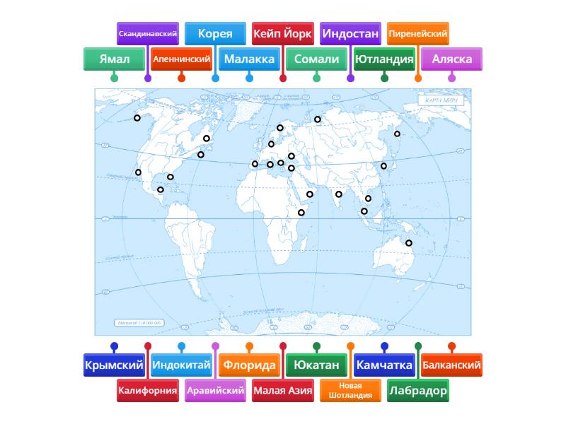 Малакка, Кейп Йорк, Пиренейский, Лабрадор, Аравийский, Камчатка, Ямал, Апеннинский, Индостан, Индокитай, Малая Азия, Флорида, Юкатан, Аляска, Крымский, Сомали, Балканский, Скандинавский, Корея, Калифорния, Новая Шотландия, Ютландия.