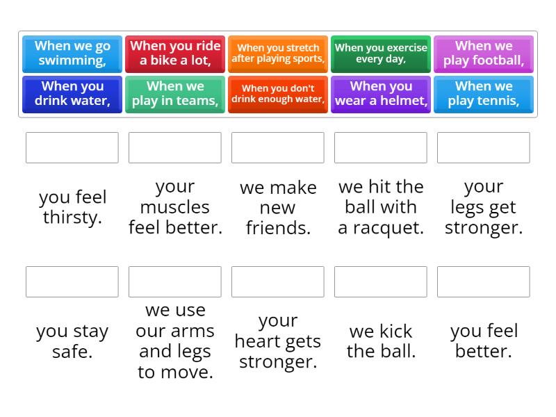 When we play football, - we kick the ball., When you drink water, - you feel better., When you stretch after playing sports, - your muscles feel better., When we go swimming, - we use our arms and legs to move., When you exercise every day, - your heart gets stronger., When we play tennis, - we hit the ball with a racquet., When you ride a bike a lot, - your legs get stronger., When we play in teams, - we make new friends., When you wear a helmet, - you stay safe., When you don't drink enough water, - you feel thirsty.,