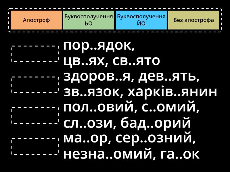 Буквосполучення ЙО - ма..ор, сер..озний, незна..омий, га..ок, Буквосполучення ЬО - пол..овий, с..омий, сл..ози, бад..орий, Апостроф - здоров..я, дев..ять, зв..язок, харків..янин, Без апострофа - пор..ядок, цв..ях, св..ято,