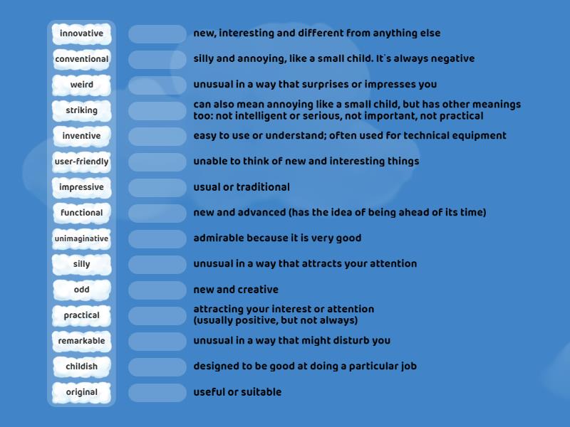 weird - unusual in a way that might disturb you, odd - unusual in a way that attracts your attention , original - new, interesting and different from anything else, innovative - new and advanced  (has the idea of being ahead of its time), inventive - new and creative, impressive - admirable because it is very good, remarkable - unusual in a way that surprises or impresses you, striking - attracting your interest or attention (usually positive, but not always), functional - designed to be good at doing a particular job , practical - useful or suitable, user-friendly - easy to use or understand; often used for technical equipment , childish - silly and annoying, like a small child. It’s always negative, silly - can also mean annoying like a small child, but has other meanings too: not intelligent or serious, not important, not practical, unimaginative - unable to think of new and interesting things, conventional - usual or traditional,
