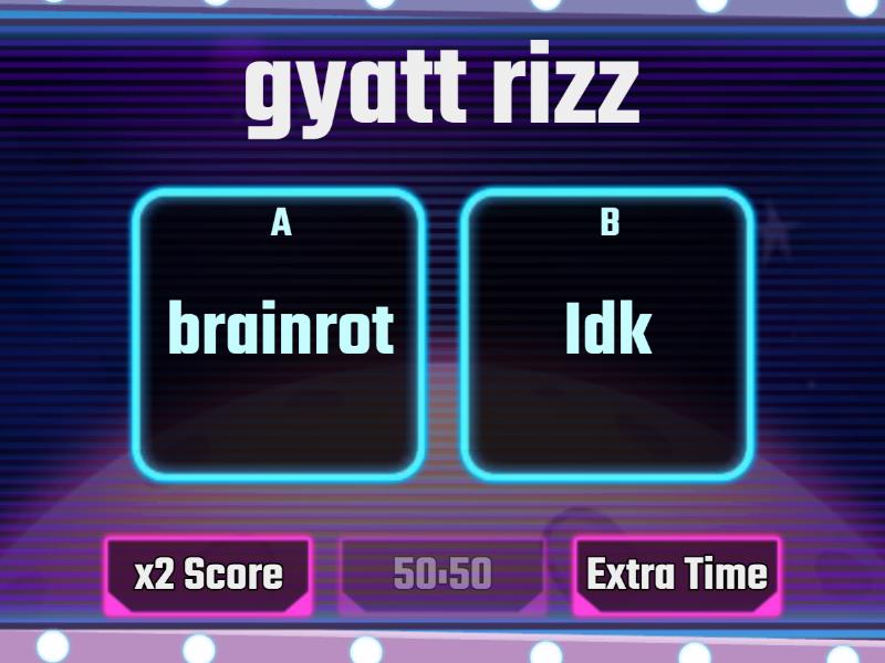 1) gyatt rizz a) brainrot b) Idk 2) skibidi sigma a) THIS IS BRAIN ROT b) NO ITS NOT c) I HATE THIS GAME d) THIS IS BORING