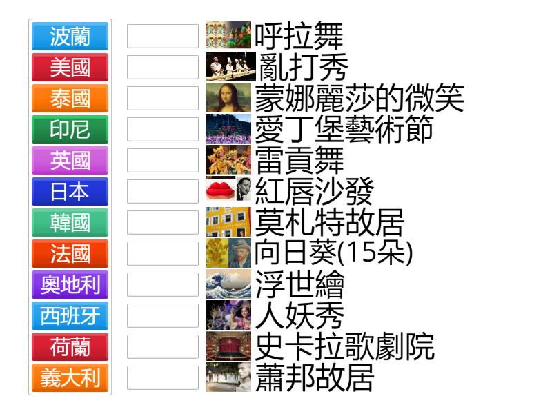 西班牙 - 紅唇沙發, 法國 - 蒙娜麗莎的微笑, 義大利 - 史卡拉歌劇院, 荷蘭 - 向日葵(15朵), 英國 - 愛丁堡藝術節, 印尼 - 雷貢舞, 韓國 - 亂打秀, 日本 - 浮世繪, 波蘭 - 蕭邦故居, 奧地利 - 莫札特故居, 美國 - 呼拉舞, 泰國 - 人妖秀,
